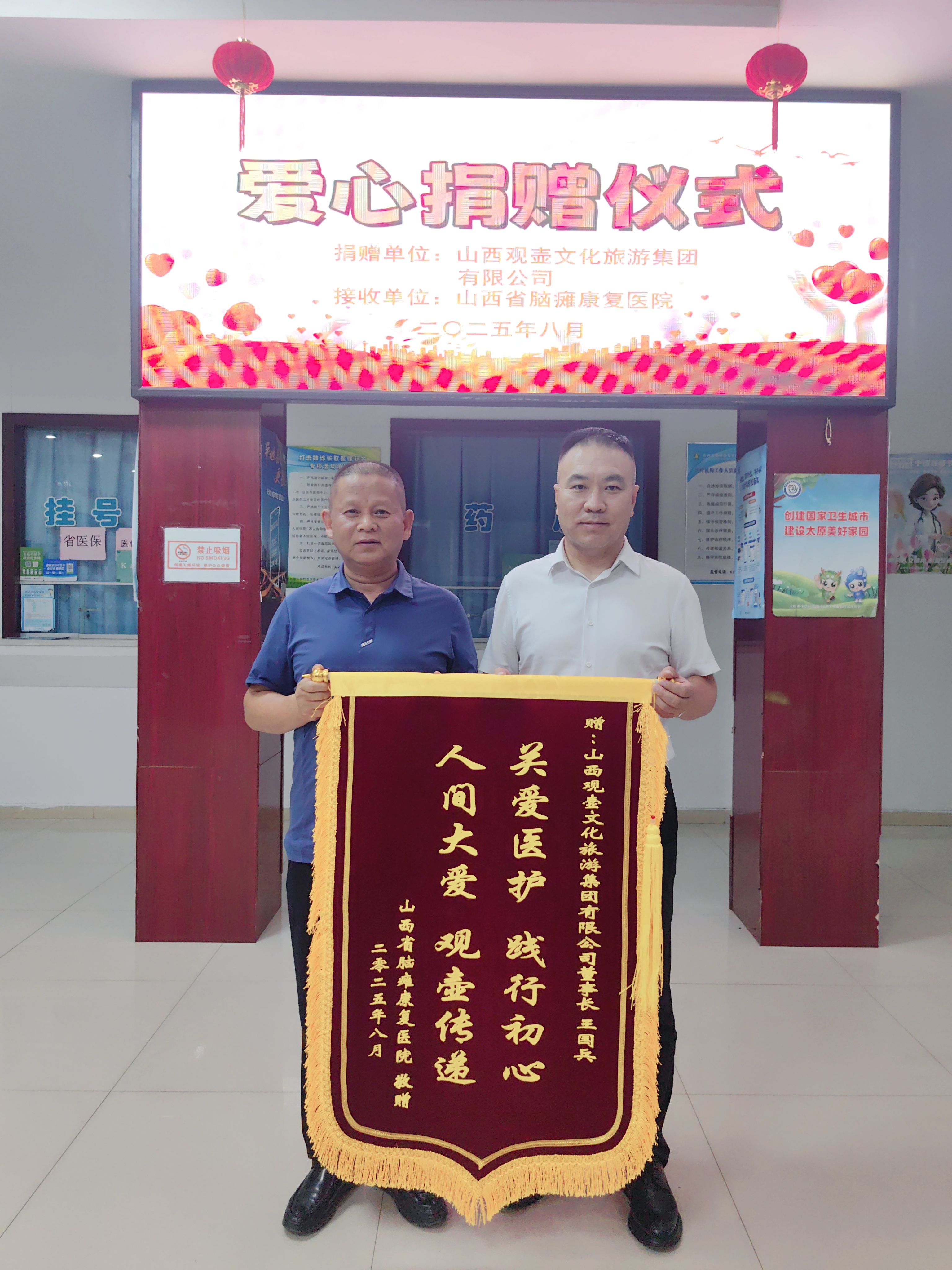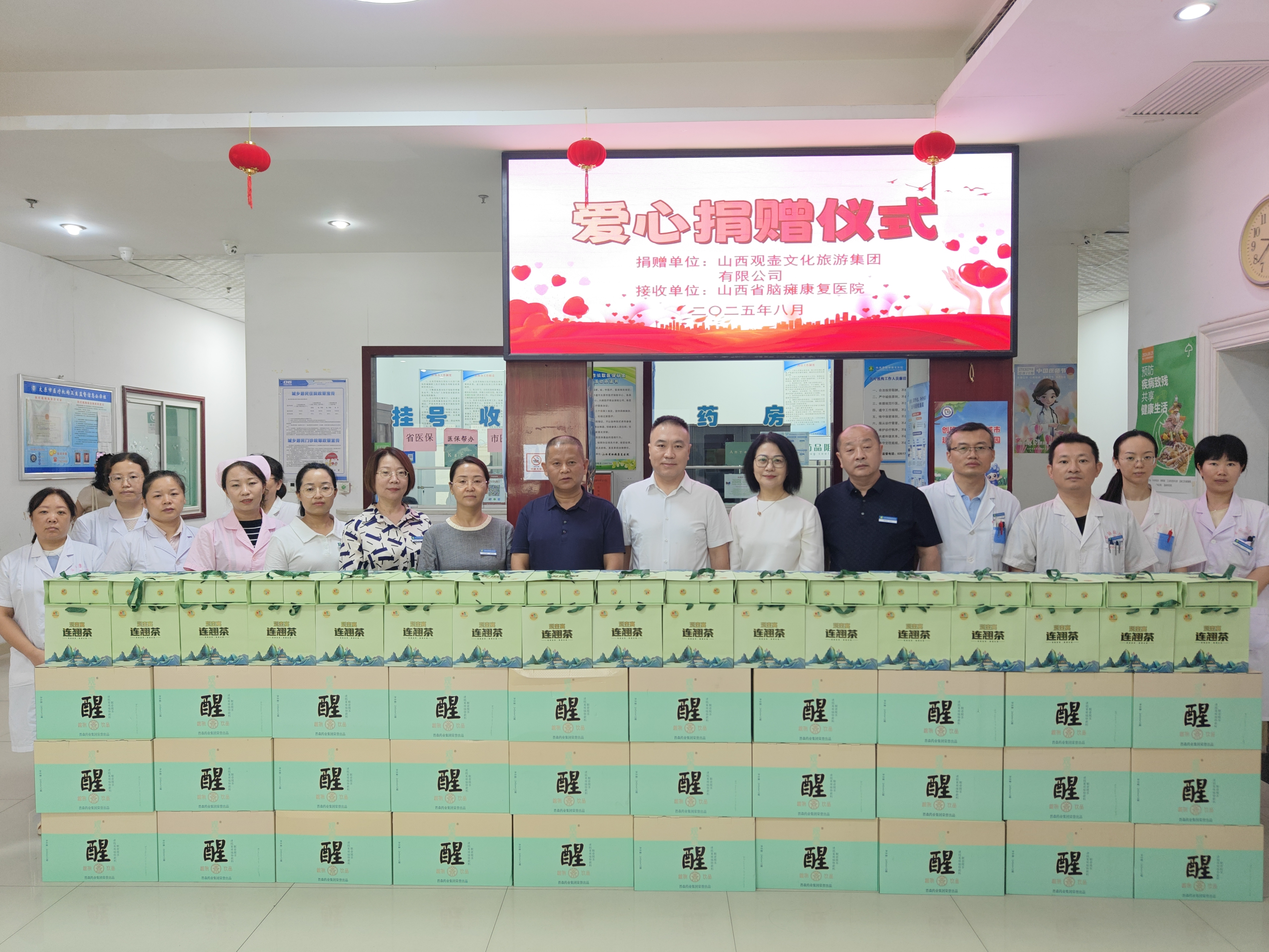 8月5日上午,在第八个中国医师节来临之际,山西省脑瘫康复医院举办了一场以“关爱医护 践行初心”为公益主题的捐赠活动。山西观壶文化旅游集团有限公司向山西省脑瘫康复医院捐赠了价值24000元的4000袋连翘茶和1200罐连翘葛根植物饮料,为医护人员的康复之路增添一丝甘甜,给繁忙的工作带来片刻舒缓。此次捐赠不仅彰显了山西观壶文化旅游集团有限公司积极履行社会责任的担当精神,以实际行动支持公益事业发展,同时也为在院医护人员带来了温暖。山西省残联教就部主任、山西省脑瘫康复医院党支部书记沙佳宽、山西省民营经济促进会副会长、山西观壶文化旅游集团有限公司董事长王国兵、山西泽凡科技有限公司董事长白荣、医院副院长张永宏、王美荣和职工代表参加了捐赠仪式。